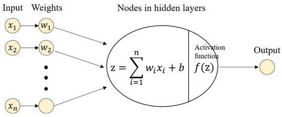 Figure 7 illustrates a structure comprising a solitary node. This node receives inputs from either the data within the input layer or the outputs of other nodes, referred to as activations. Each input to the node is associated with a weight (notated as ‘w’) and a bias (notated as ‘b’) or a threshold. The weight characterizes the influence of the input on the node’s response. The node computes the weighted sum of inputs and subsequently applies an activation function, which may include threshold functions, Sigmoid functions, Rectified Linear Unit functions (ReLU), Hyperbolic Tangent functions, and Softmax functions, among others, to determine the node’s output. Training the neural network can be accomplished using various training algorithms, with the Backpropagation (BP) algorithm being one of the most widely adopted choices. The BP algorithm is employed to adjust the weights of neural network nodes, with the objective of minimizing the sum of squared errors during the training phase.