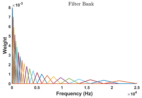 The center frequency of each triangular filter j is denoted as , and their values are calculated by approximating the Mel scale as detailed in [45,47].