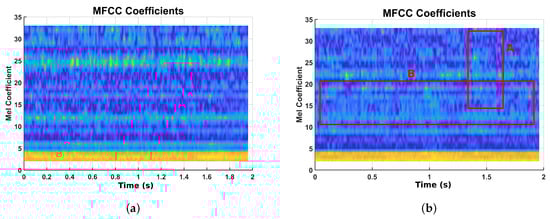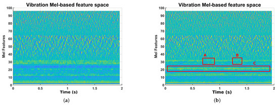 The MFCC representation for two vibration signals acquired from the multi-stage centrifugal pump is shown in Figure 2. The MFCC for the healthy centrifugal pump is in Figure 2a while the MFCC for a vibration signal corresponding to a centrifugal pump with the faulty condition is shown in Figure 2b. In this representation, the differences between both cases, related to the presence of faults, are the presence of frequency bands with increased energy (shown by rectangle B) or events that occur at a specific time with increased (or decreased energy) as the one shown in rectangle A.