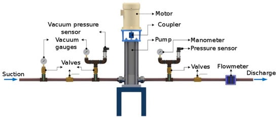 The experiments were performed over a vertical ten-stage centrifugal catalog number 3SV10TE4F60 driven by a two-hp induction motor that provides rotatory motion at 3500 rpm. The technical specifications are presented in Table 1. The main parts of the vertical centrifugal pump test bench are shown in Figure 3, while Figure 4 shows the sensor placements.
