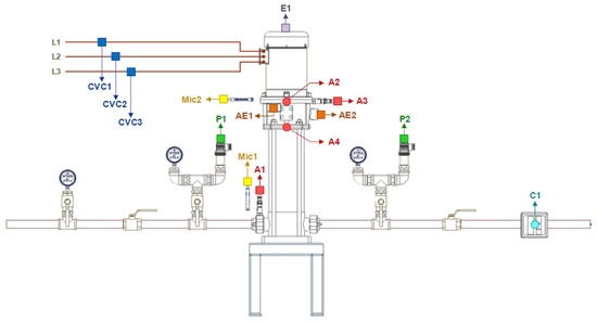 The test bench of the reciprocating compressor in centered around a two-stage compressor model EGB-250. Several sensors are shown: the accelerometers (A1, A2, A3, and A4) are shown in red. The pressure sensors (P1, P2, P3 and P4) are shown in green. Two microphones sensors (Mic1, Mic2) are shown in gray. One rotary encoder (E1) is shown in gray.