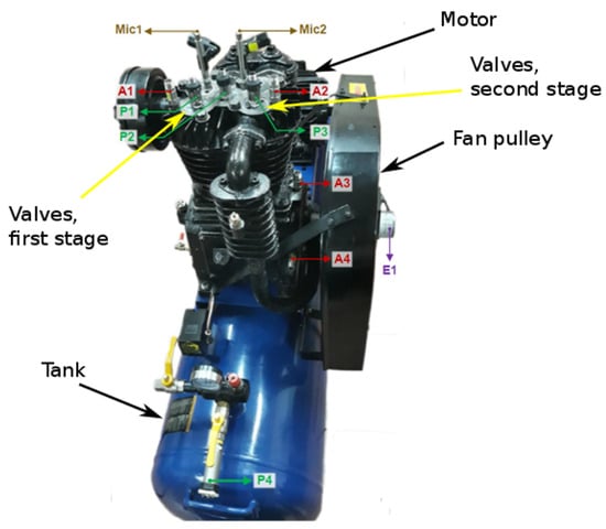 In the first stage, two valves, the intake valve, and the discharge valve, enable the transfer of the gas to the second stage. The second stage also has two valves: the inlet and the discharge valves for transferring the air to the tank. The reciprocating compressor test bench is shown in Figure 5. The sensor placements are shown corresponding to four accelerometers (A1, A2, A3, and A4), four pressure sensors (P1, P2, P3 and P4), two microphone sensors (Mic1, Mic2) and one rotary encoder (E1). Only the vibration signals acquired with the accelerometers were considered in this research.
