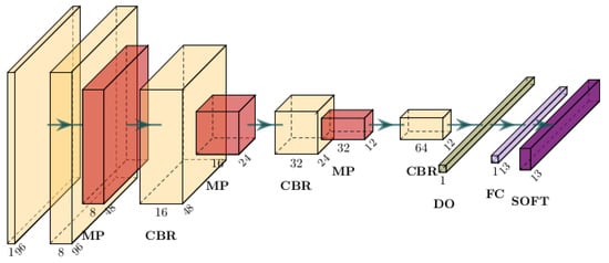 Each original vibration signal is subdivided into five signal fragments of two seconds each, of 100,000 samples. The MFCC features are calculated for each of the five signal fragments. The spectrogram is calculated using a Hanning window of size 40 ms for each signal fragment. This window is moved along the signal with a stride of 0.5 ms. To calculate the energy bands during calculation of the MFCC, the number of filters in the filter bank is set to . Such filters are calculated with filter centers linearly spaced in the range [0, 1000] Hz and filter centers logarithmically spaced in the range (1000, 25,000] Hz. After processing with the filter bank and obtaining the MFCC coefficients, an array of size is obtained for each signal fragment. Similarly, the and derivatives are calculated from the MFCC array previously obtained. The calculation of features in Equation (9) is performed by using a filter of size 11 to obtain a good approximation accuracy with moderate noise amplification. The coefficients correspond to 1-D higher order derivatives as detailed in [51]. The FIR derivative filter of size has coefficients and the resultant array has a size of . In addition, the is estimated from the array by using an FIR filter of size 5 with coefficients . The lower window size reduces the noise amplification of the second derivative. The array also has a dimension of . The concatenation of the MFCC, and along the frequency axis while maintaining the temporal axis is proposed in this work. Each feature array (MFCC, and ) is processed with the Z-score normalization and then concatenated to obtain an array of size .