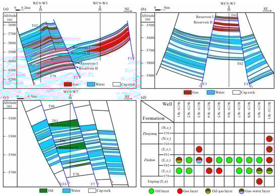 The east-west trending and northward dipping F1 fault acts as the sealing fault for the northern part of Field A. In cross-section, the fault is steeply dipping, significantly offsets horizons and cuts downwards into the Late Eocene Wenchang Formation, and extends upwards to the Late Miocene Yuehai Formation. The F2 exhibits a similar geometry to the F1 fault, with a near east-west trend and northward dip, and serves as the sealing fault for the southern part of Field A (Figure 4). The F2 normal fault has a gentler dip angle and is of a smaller scale compared to the F1 fault. It cuts downwards into the Wenchang Formation and extends upwards to the first member of the Early Miocene Zhujiang Formation (N1z1).