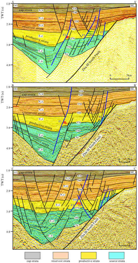 Under the influence of the clockwise-rotating stress field during the Cenozoic, the fault systems in the study area exhibit a complex pattern consisting of multiple stages and directions. During the Paleocene to Early Oligocene, the stress field was characterized by NW–SE extension, resulting in the formation of a series of NE-trending faults primarily within the Late Eocene and Early Oligocene Wenchang and Enping Formations (Figure 2) [53]. Subsequently, from the Late Oligocene to Middle Miocene, the stress field shifted towards near N–S extension, leading to the development of a series of nearly E-W-trending faults, predominantly distributed in the Zhuhai and Zhujiang Formations of the same age (Figure 2). Lastly, since the Late Miocene to the present, the stress field exhibited NNE–SSW extension, giving rise to a series of WNW-trending faults primarily developed within the Miocene Hanjiang and Yuehai Formations (Figure 2).