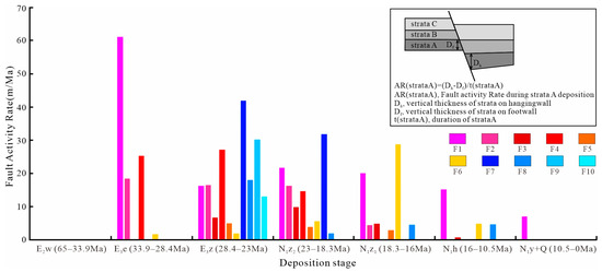 The average dip-slip fault displacement rate of the F1–F10 during different deposition periods in the southern Wenchang A subbasin.