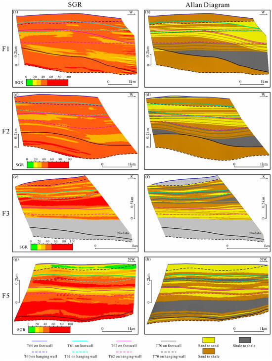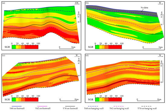In pursuit of this goal, we conducted SGR calculations for faults F7–F10. It is noteworthy that due to the complexity of seismic reflections, identifying the T61 seismic reflection interface on F7–F10 faults presents challenges. The outcomes of our analysis reveal significant heterogeneity in the SGR distribution along the F7 fault. Specifically, the upper fault segment displays a pattern of either non-sealing (SGR < 15) or moderate (15 < SGR < 25) lateral sealing, whereas the lower fault segment exhibits robust (SGR > 25) lateral sealing (Figure 10a). This observation suggests that the upper segment of F7 could function as a lateral conduit, while the lower segment is likely to act as a barrier to hydrocarbon flow. Conversely, F8 generally exhibits non-sealing behavior along its entire fault surface, except for a moderate lateral sealing capacity in its middle portion (Figure 10b). Consequently, it may be broadly considered a lateral conduit. On the other hand, both F9 and F10 demonstrate a consistent strong lateral sealing capacity along their fault surfaces (Figure 10c,d). This finding implies that both F9 and F10 are poised to act as formidable barriers, preventing the passage of hydrocarbon fluids across these fault zones.