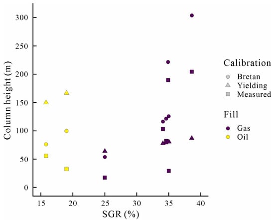It is important to note that when using this method, it is necessary to define the lower limit of the SGR, which indicates the threshold at which hydrocarbons can be sealed. Otherwise, even if the SGR value is very low, it could still be calculated as a positive value, leading to the sealing of a certain column height of hydrocarbons. The buoyancy pressure generated by the hydrocarbon column can be treated as equivalent to the AFPD or capillary threshold pressure. However, further charging will result in the buoyancy pressure exceeding the capillary threshold pressure, leading to leakage. The height of the supported hydrocarbon column can be calculated using Equation (5):