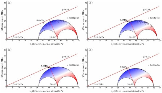 Mohr diagrams illustrating the fracture stability for F1 (a), F2 (b), F3 (c), and F5 (d). Black arrows show the increase in pore pressure needed to force the fault into failure.