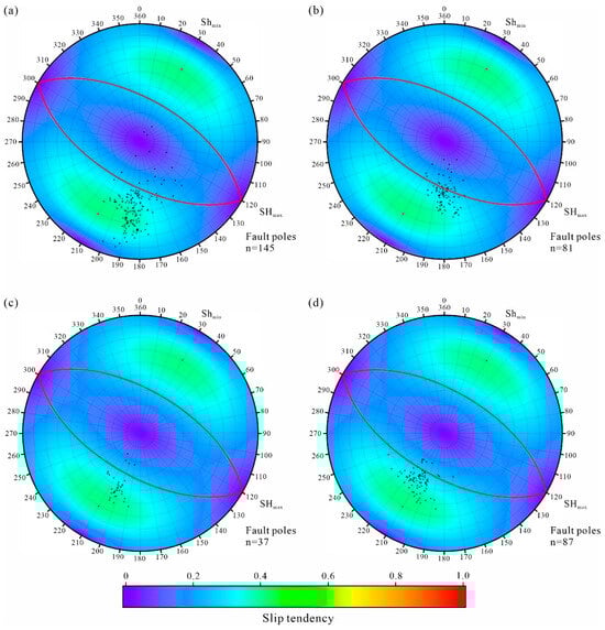 Stereoplots illustrating the slip tendency for F1 (a), F2 (b), F3 (c), and F5 (d).
