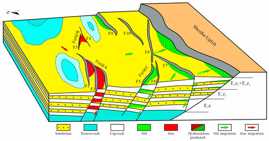 In this context, F8 exhibits weaker lateral fault sealing, allowing hydrocarbons to directly cross it and enter traps that are bounded by the basin boundary fault. This process can lead to hydrocarbon accumulation across the entire Zhuhai Formation reservoirs (Figure 12). In contrast, F7 demonstrates robust lateral sealing in its lower segment but weaker sealing in the upper portion. Its vertical sealing capacity is robust and far from failure. Consequently, hydrocarbons accumulate in the hanging wall trap of the E3z3 sequence (aligned with the lower fault segment), while in the E3z1 and E3z2 sequences (corresponding to the upper fault segment), hydrocarbon flow laterally permeates the fault zone and infiltrates the fault compartment bounded by the basin boundary fault (Figure 12).