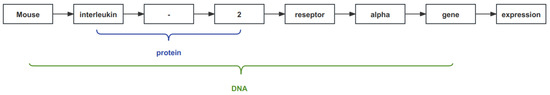 However, certain texts contain named entities that are nested or overlapping, giving rise to what is known as nested entities or entity nesting [6]. These complexities are prevalent in particular domain-specific datasets. Most researchers concentrate on resolving flat entities [7]; the existence of nested entities in text often goes unaddressed. Refer to Figure 1 for an illustrative sentence extracted from the GENIA dataset [8]: “Mouse interleukin-2 receptor alpha gene expression”. In this sentence, “interleukin-2” is categorized as a “protein” entity type. Notably, “interleukin-2” also exists within the “DNA” entity type “Mouse interleukin-2 receptor alpha gene”. This scenario exemplifies a nested entity, where “interleukin-2” holds multiple entity-type associations within the same text span. Sequence labeling methods are commonly employed to tackle NER tasks. However, these methods confine each token to representing only one entity category, disregarding the possibility of multiple entity categories associated with a single token within nested entities. Addressing this issue, some researchers proposed solutions such as the “merged label layer” [9], a method involving sequence labeling models annotating multiple entity categories on tokens with nesting challenges. Although straightforward, this method leads to label expansion, resulting in model sparsity.