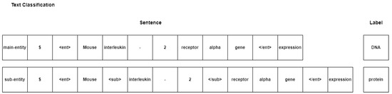 Given our approach of unifying entity categories in the initial sequence annotation process, we have encountered limitations in achieving more precise entity classifications. As a result, incorporating an additional text classification model is crucial for effectively distinguishing between different entity categories. Figure 4 showcases the use of identifiers for text annotation within the entity category classification phase, employing example sentences from the GENIA dataset for illustration. The text includes category tags representing distinct entity types, along with position markers that indicate the boundaries of the entities, all integrated within sentences. Our category tags are divided into two main classifications: “main entity” (ent) and “nested entity” (sub). The position markers, like <ent> and </ent> for starting and ending recognized main entities and <sub> and </sub> for marking the beginning and end of recognized nested entities, act as our guide for annotations. For the annotation protocol of the classification model, the following applies: