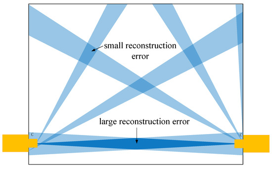 As shown in Figure 3, a simple rectangular environment with two cameras placed opposite each other at the boundary edges is given to clarify the influence of sensor spatial position uncertainty on reconstruction results. The vision sensor can be considered as an orientation sensor to measure the azimuthal angle to the target point, and the uncertainty range of angle measurement is indicated by a light blue triangle. Based on the measurements of the two sensors, the reconstructed coordinates of the target point can be obtained by solving the triangulation method. The two triangular overlapping regions indicate the reconstruction region of this target point, and the size of the region characterises the size of the uncertainty in the position reconstruction, i.e., the reconstruction error. In this case, the dark blue region on the line connecting the two sensors indicates low reconstruction accuracy, while the smaller blue regions in the upper and lower halves indicate high reconstruction accuracy [20]. It can be seen that the positional uncertainty on the straight line between the two sensors is high due to the geometric properties of the sensors. Therefore, if the target point is located in this region, the reconstruction error is higher.