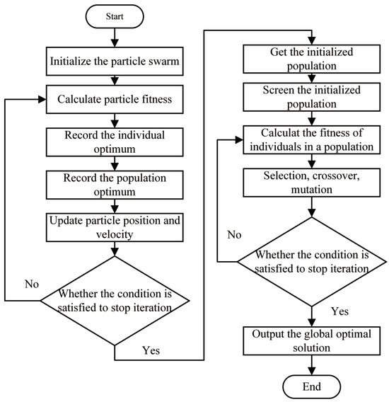 Through the above analysis, it is shown that both GA and PSO have advantages and disadvantages. Therefore, in this section, a combined algorithm is proposed to merge the advantages of the PSO and the GA. First, the PSO is used, and the result is taken as the initial value of the GA, which can reduce the running time, improve the efficiency of the algorithm, and avoid the algorithm falling into the local optimal solution as far as possible. Figure 5 is a flowchart illustrating the combined algorithm.