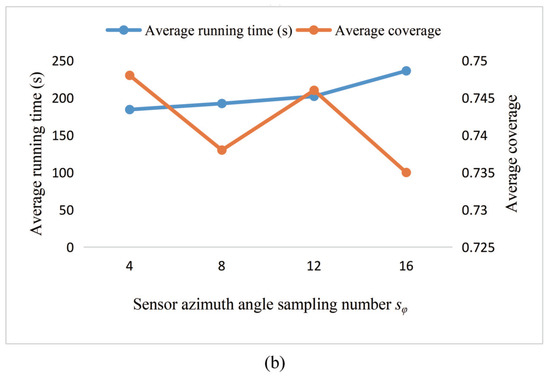 As shown in Figure 7a, as the sampling interval of the sensor position increases, there is a general downward trend in average coverage due to degradation in model accuracy. It is worth noting that the change in running time is not so noticeable. The possible reason is that the sampling interval increases, the solution space that needs to be searched becomes smaller, and then the search process seems to become faster. However, when there is more than one optimal placement scheme, but with fewer search options available, some solutions are missed, which reduces the number of optimal options available. Therefore, the difficulty in searching increases, and the search time is not significantly reduced. Figure 7b shows the results of different sampling numbers of the sensor azimuth angle. It is found that, as the number of sensor azimuth sampling points increases, the average running time increases, but the coverage does not increase steadily. The possible reason for this situation is that the experiment uses a relatively simple rectangular unobstructed target space. The four optional azimuths can already satisfy the necessary coverage requirements, so a slight increase in sampling points cannot significantly improve optimization performance.