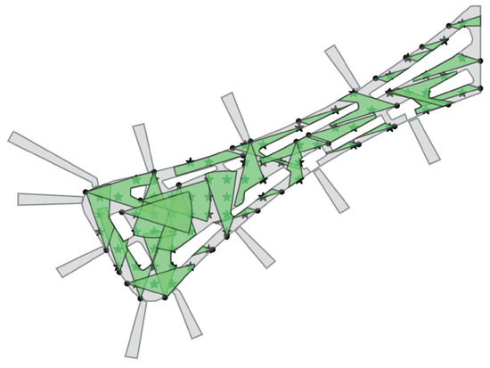 Figure 8 shows the optimization effect of camera coverage in the corridor. In this experiment, the sampling interval is 15 m, and the green area represents the coverage of the camera, where the of the camera is 60 m and the is 37°. By adjusting the layout of the camera, full coverage of the target space with obstacles can be achieved. We can adjust the sampling interval and the and of the camera according to the actual needs. We will conduct a more thorough investigation on this topic in the future; this is merely an overview of the situation with obstacles.