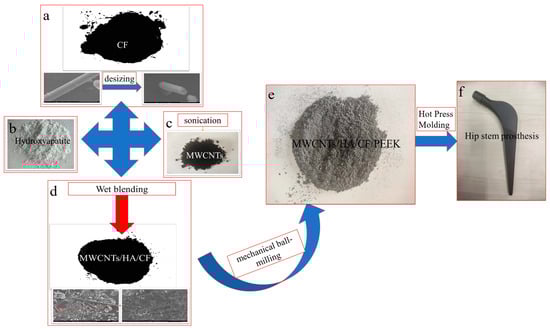 Material preparation and application. (a) De-sized carbon fiber; (b) hydroxyapatite; (c) ultrasonication of multi-walled carbon nanotubes; (d) preparation of MWCNT/HA/CF ternary composites via wet blending; (e) preparation of MWCNT/HA/CF/PEEK quaternary composites via ball milling blending; (f) quaternary composites for the preparation of prostheses.