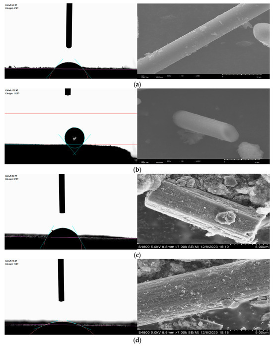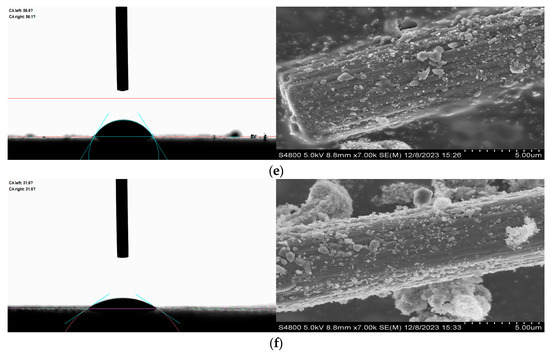 SEM images with contact angle of (a) original carbon fiber; (b) de-sized carbon fiber; (c) CF1; (d) CF2; (e) CF3; (f) CF4.