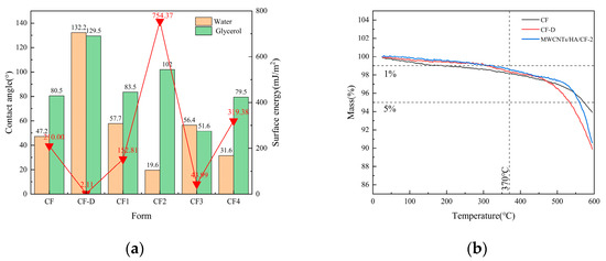 - Due to the addition of multi-walled carbon nanotubes and nanohydroxyapatite, the surface energy of the ternary composites increases, the contact angle decreases, and the hydrophilicity is enhanced. The CF2 composites exhibited better heat resistance than the original carbon fibers. The de-sized carbon fibers were prepared to meet the requirements of the hot compression molding process. Additionally, the surface roughness of the carbon fiber in the CF2 composites increased.