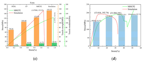 The tensile modulus, tensile strength, and compressive strength of CP MHCP2 materials were tested using a universal testing machine and simulated, analyzed, and compared with the data.