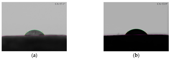 The MWCNT/HA/CF/PEEK quaternary composites and original carbon-fiber-reinforced polyetheretherketone composites were selected and prepared as solid surfaces for contact angle experiments. A drop of deionized water was placed on the surface of each specimen, and the contact between the liquid and the solid surface was observed. The value of the contact angle was obtained by measuring the angle formed by the liquid surface at this contact point. The value of the contact angle is shown in Figure 4, which indicates that the contact angle of specimens prepared from the MWCNT/HA/CF/PEEK quaternary composites is 3.2° smaller than that of the original carbon-fiber-reinforced polyetheretherketone composites. If the contact angle is small, the liquid tends to spread more on the solid surface, which usually results in the liquid being more readily absorbed or expanded onto the solid surface. This property is essential in many fields, such as the study of cell–matrix interactions in biology. Hydrophilicity enables composites to be used more effectively in liquid environments; it enhances a material’s ability to resist fouling. For example, hydrophilicity allows a surface to come into easy contact with liquids, which aids in wetting, adsorption, and the transfer of liquids. Furthermore, hydrophilicity allows such materials to attach more water molecules, limiting the build-up of other contaminants and fouling on their surfaces. Using physical film-forming methods, such as condensation, and chemical film-forming methods, such as impregnation, to form a thin film layer of a certain thickness from MWCNT/HA/CF/PEEK tetrameric composite powders prevents surface fouling. It is suitable for applications that require long-term maintenance and cleaning.