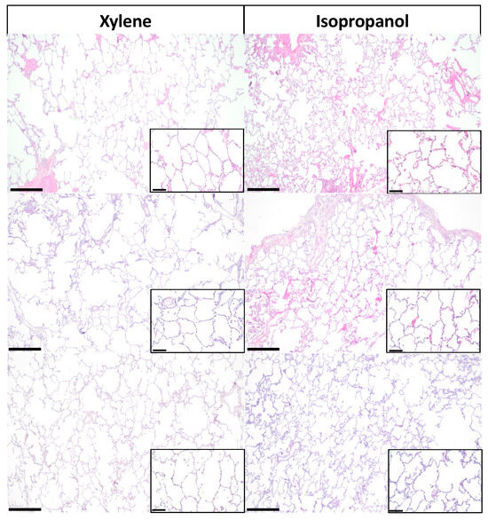 Hematoxylin and eosin staining images of lung tissue in xylene and isopropanol. Representative images of hematoxylin and eosin (H&E) staining of lung tissue demonstrate the staining effects of xylene (left) and isopropanol (right). Scale bar in the larger image represents 500 µm, and the callout shows a magnified portion of the tissue where the bar represents 100 µm.