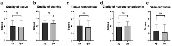 Scoring results of H&E staining characteristics in lung tissue sections processed with xylene and isopropanol. Histological analysis of H&E staining was performed on tissue sections obtained from donor and recipient lung biopsies. The scoring results were assessed based on the following criteria: overall quality of tissue (a); quality of staining (b); tissue architecture (c); clarity of nucleus–cytoplasmic differentiation/integrity (d); vascular tissue (e). n = 12. ns: nonsignificant (p > 0.05).