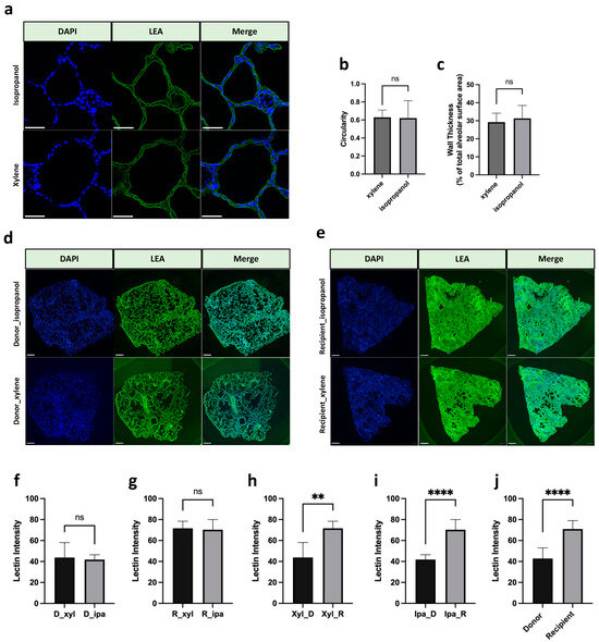 Fluorescent staining of lung tissue in xylene and isopropanol. (a) Representative images of fluorescent staining of LEA (green, 1:500) and DAPI (blue, 1:1000) staining in lung slides. Scale bar represents 50 µm. (b,c) Quantification of alveolar morphology metrics at xylene and isopropanol groups, ns: nonsignificant (p > 0.05). (d,e) Representative fluorescent staining images by DAPI and LEA. Scale bar in the pictures represents 1000 μm. (f) Lectin intensity of donor lung slides (xylene vs. isopropanol). (g) Lectin intensity of recipient lung slides (xylene vs. isopropanol). (h) Lectin intensity of xylene processed slides (donor vs. recipient). (i) Lectin intensity of isopropanol processed slides (donor vs. recipient). (j) Lectin intensity of both xylene and isopropanol processed slides combined (donor vs. recipient). n = 12. p > 0.05; ** p < 0.01, **** p < 0.0001. ns: nonsignificant. D, donor; R, recipient; Xyl, xylene; Ipa, isopropanol. DAPI, 4′,6-diamidino-2-phenylindole; LEA, Lycopersicon esculentum lectin.