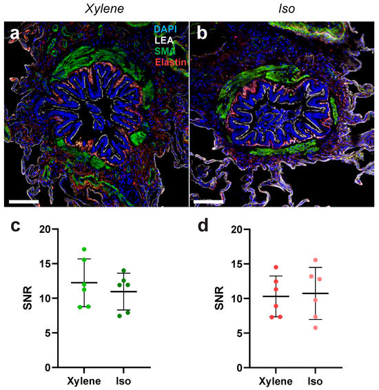 Multiplex antibody labeling efficacy of lung tissue in xylene and isopropanol clearing. (a) Representative images of bronchioles stained for SMA and elastin, as well as lectin and DAPI, from a tissue sample cleared with xylene. (b) Representative images of bronchioles stained for SMA and elastin, as well as lectin and DAPI, from a tissue sample cleared with isopropanol. Scale bar in the pictures represents 100 μm. (c) Quantification of the SNR between xylene and isopropanol tissue clearing for an SMA primary antibody stain with a 568-secondary conjugate. (d) Quantification of the SNR between xylene and isopropanol tissue clearing for an elastin primary antibody stain with a 647-secondary conjugate. n = 6. DAPI, 4′,6-diamidino-2-phenylindole; LEA, Lycopersicon esculentum lectin; SMA, smooth muscle actin. SNR, signal-to-noise ratio.