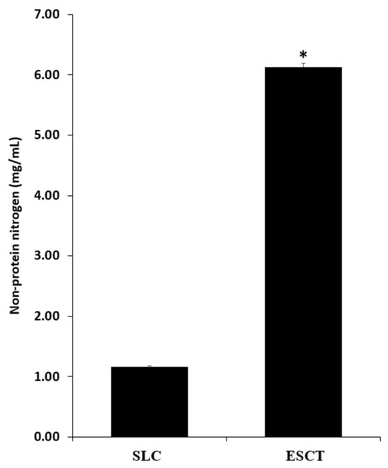 The NPN method measures the nitrogen compounds produced by protein degradation through hydrolysis, and the degree of protein hydrolysis by enzymatic treatment can be determined using NPN. ESLC showed significantly higher NPN levels than SLC (p < 0.05), confirming that SLC was effectively hydrolyzed by enzymatic treatment (Figure 1).