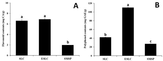 The flavonoid and polyphenol contents of SLC, ESLC, and SMSP extracts were analyzed (Figure 2). The flavonoid contents of SLC and ESLC were 6.58 ± 0.28 mg CA/g and 6.87 ± 0.15 mg CA/g, respectively, which were significantly higher than the flavonoid content of SMSP, which was 1.96 ± 0.03 mg CA/g (p < 0.05). The total polyphenol content was significantly highest in ESLC, with 110.12 ± 1.20 mg GAE/g (p < 0.05), followed by SLC with 42.02 ± 0.26 mg GAE/g and SMSP with 27.08 ± 0.40 mg GAE/g.