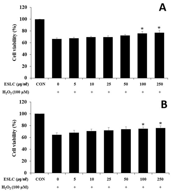 Effect of ESLC on the viability of SH-SY5Y cells impaired by H2O2 treatment. (A) SH-SY5Y cells were pretreated with different concentrations of ESLC for 1 h, followed by treatment with 100 μM H2O2 for 30 min. (B) SH-SY5Y cells were treated with 100 μM H2O2 for 30 min, and then the medium was replaced, and different ESLC concentrations were treated for 18 h. The means ± SEM are presented as values. The data were analyzed using Student’s t-test (* p < 0.05). CON, control; ESLC, enzymatic hydrolyzate from silkworms fed the leaves of Cudrania tricuspidata.