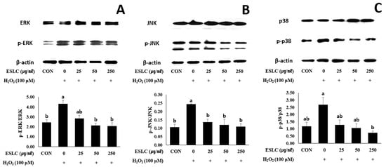 Effect of ESLC on MAPK signaling pathway in SH-SY5Y cells impaired by H2O2 treatment. (A) p-ERK/ERK; (B) p-JNK/JNK; (C) p-p38/p38. Values are means ± SEM. Significant differences (p < 0.01) were observed among the groups, as indicated by the different letters (a,b) above the bars in the one-way ANOVA with Duncan’s multiple range test. CON, control; ESLC, enzymatic hydrolyzate from silkworms fed the leaves of Cudrania tricuspidata. ERK, extracellular signal-regulated kinase; JNK, c-Jun N-terminal kinase; p-ERK, phospho-extracellular signal-regulated kinase; p-JNK, phospho-c-Jun N-terminal kinase; p-p38, phospho-p38.
