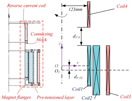 As shown in Figure 1, the magnet coil is intended to be wound using an odd–even layer winding technique. To enhance the magnetic field gradient and reduce the external diameter of the magnet, an additional coil with reverse current is added in the longitudinal direction.