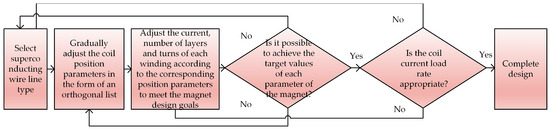 While satisfying the specified magnet parameters, the design places emphasis on the combined structure of the magnet coils, involving several variables: the axial distance (d1–4) between coils 1 and 4; the deviation distance (d1–23) between the centers of coil 1 and coils 2 and 3, between the single-layer turns, and between the layers of coil 4, as well as between the single-layer turns and the layers of coils 1, 2, and 3. According to engineering practice, one must note the distance between coils 1 and 2 and the gaps between coil 3, which consist of the thickness of the insulation layer, the thickness of the preload layer, and that of the coil gap. Under the premise of leaving a certain margin, these three types of thickness are all fixed values, and the space for optimization is small. Therefore, in this design, the gaps between coils 1, 2, and 3 do not need to be optimized. The ultimate goal of optimization is to minimize the cost of wire usage for the coils. Table 4 presents the crucial electromagnetic parameters obtained after optimizing the magnet. The optimization iteration of electromagnetic field design is carried out step by step according to the following rules (Figure 2).