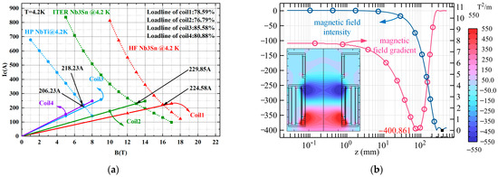 (a) The relationship between the critical current of the wire and the magnetic field. The solid wire is the load line of the wire, and the operating current at this time is 176.5 A; (b) the gradient distribution on the axis of the magnet, where the cloud map shows the magnetic field gradient distribution on the cross-section of the magnet.