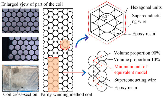 As depicted in Figure 6, the average finite element model of the magnet utilizes the parity layer winding method for its winding. The main feature of this coil winding method is that the odd-numbered layers in the winding have one more turn than the even-numbered layers, and the wires in adjacent layers alternate with each other in the central axis direction, forming a regular hexagonal structure with a center angle of 60°. The smallest unit of the winding is a positive triangle, with superconducting wires constituting 90% and epoxy resin constituting 10%. Based on the above conclusion, the material of the superconducting coil is regarded as a composite material composed of epoxy resin and superconducting wire, which is equivalent to epoxy resin as the substrate, superconducting wire as fibers, with a fiber ratio of 0.9. The fibers are evenly distributed along the direction of the wire in the substrate.