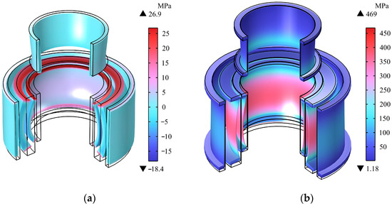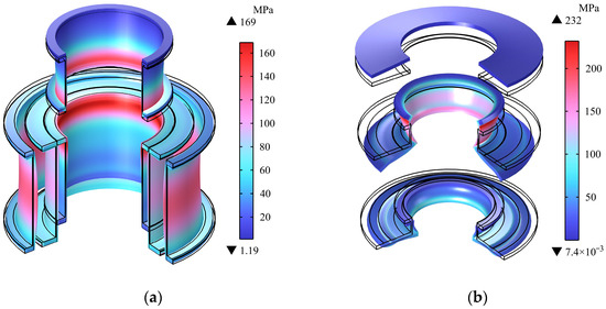 After determining the preload parameters using the method mentioned earlier, calculate the stress distribution of the magnet under the preload condition. Add generalized stretching modules in non-local coupling to the domain where each coil is located in COMSOL to obtain radial and circumferential stretching vectors. Afterwards, radial and circumferential Lorentz force loads were added to the coil domain in the electromagnetic module, and the radial and circumferential stress distributions for each coil were calculated as shown in Figure 9 and Figure 10. From Figure 9, it can be seen that the maximum radial stress of coils 1 and 3 is −2.13 × 10−3 MPa, close to 0. At the same time, the maximum radial stress of coil 4 is 5 MPa, which is still lower than the allowable shear stress of epoxy resin of 20 MPa.