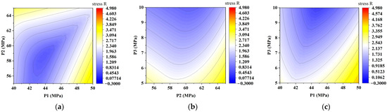After solving, 4851 sets of maximum stress values of coils 1–3 can be obtained. After processing the data, the P1P2, P2P3, and P1P3 factor response surfaces are obtained, as shown in Figure 8. It can be seen from the figure that the response surface plot is tile-shaped. In the optimal solution area, 30 groups of solutions with negative stress peaks can be obtained, all of which are valid solutions. The contour line in the figure is the sum of the maximum radial stresses on the three coils. It can be seen that the effective solutions are distributed in the dark-blue area, and the darkest area is the theoretical optimal solution.