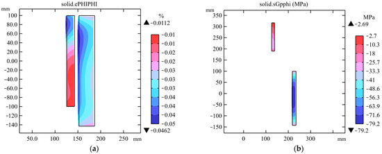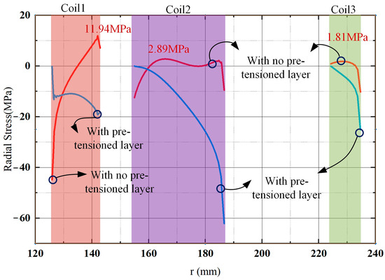 Figure 11 shows the radial stress changes of magnet coils 1–3 before and after adding preload force. It can be seen from the figure that after adding coil pre-tightening force, the peak radial stress of each coil dropped from the previous 11.94 MPa, 2.89 MPa, and 1.81 MPa to negative values, respectively.