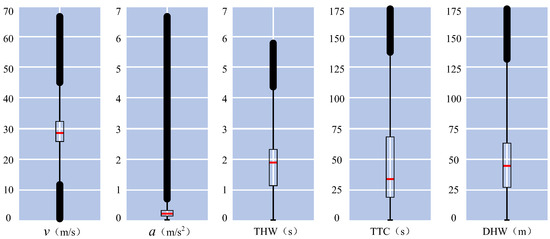 The red line segment in Figure 1 shows the median of the statistics and the average longitudinal speed of the vehicles is 28.04 m/s, which indicates the pronounced acceleration and deceleration behaviors. The data show an average headway time of 1.90 s and an average spacing of 52.58 m, suggesting that vehicles generally maintain a medium following distance. However, a notable amount of data points toward shorter following distances. Additionally, the average time to collision stands at 48.74 seconds, further illustrating the driving behavior patterns observed in the dataset.