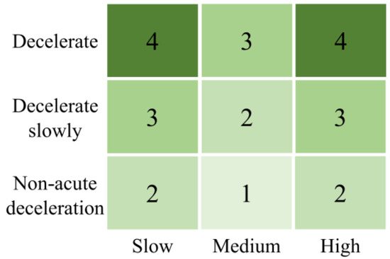 where is the vehicle speed (m/s); is the deceleration speed(m/s2), which is set according to the vehicle type, and the deceleration speed of a passenger car is set to 3.4 m/s2 [20]; is the gravitational acceleration; is the gradient of the road; and is the driver’s reaction time(s), which is usually 2.5 s [21].