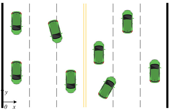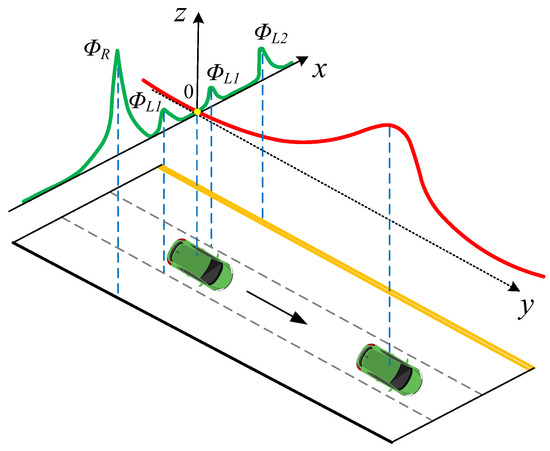 As shown in Figure 4, there are two types of road markings in the road traffic scenario: the dashed gray line indicates the lane demarcation line, which allows vehicles to cross the line to change roads, and the double yellow line regulates the direction of vehicle travel, which prohibits crossing over to change lanes. They form a road line field, constraining vehicles to maintain their position in the middle of the lane. Assuming the leftmost road marks the location for the axis , with reference to the class of Gaussian function to build the road line potential field model, the formula is as follows