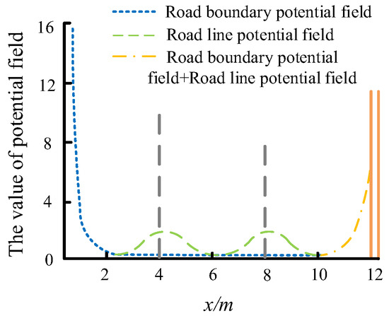 The potential field generated by road boundaries exerts a significant influence on vehicles in motion, intensifying as the distance to the boundary decreases. This mechanism effectively deters vehicles from approaching too closely, thereby mitigating the risk of collisions. Generally, there are two road boundaries, and the road boundary potential field can be expressed as