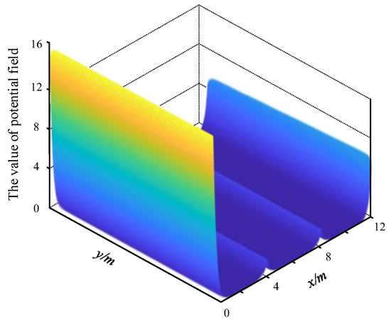 Within the potential field, the intensity of the potential at any point is negatively correlated with the distance to the target vehicle. Typically, the intensity of the potential field decreases as the distance increases. The coordinates of the vehicle’s center of mass are set as , and the distance between any point and the target vehicle can be represented as