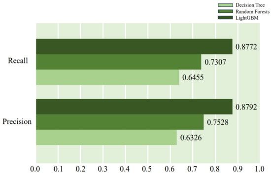 An evaluation of Decision Tree, Random Forest, and LightGBM algorithms, as illustrated in Figure 10, compares the precision and recall rates across three heeling risk-prediction models. The Decision Tree algorithm exhibits lower performance metrics, whereas LightGBM outperforms with the highest overall precision and recall rates.