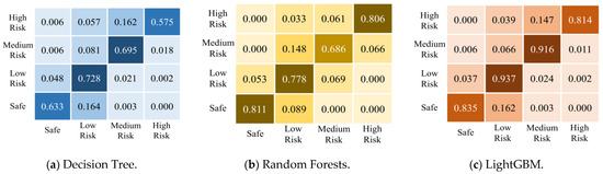 In Figure 11, the recalls for different vehicle risk propensities are shown in different color depths, with darker colors indicating larger values. The Decision Tree algorithm achieves a recall of 0.695 for medium-risk classifications, indicating that 69.5% of medium-risk samples are correctly identified, with a high-risk classification recall of 0.575, resulting in an average medium and high-risk recall of 0.635. The Random Forest algorithm records a medium-risk recall of 0.686 and a high-risk recall of 0.806, averaging a medium–high risk recall of 0.746. LightGBM demonstrates superior recall rates of 0.916 for medium–risk and 0.814 for high-risk classifications, achieving an average medium–high risk recall of 0.865. This performance underscores LightGBM’s superior effectiveness in identifying medium–high risk conditions accurately.