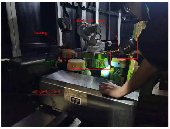 In the current operation of magnetic particle testing for bearings, most of the procedural steps can be automated by inspection equipment. For instance, a bearing magnetic particle-testing machine can automatically handle tasks such as bearing loading, magnetization, spray application, rotation, and demagnetization. However, the observation, evaluation, and corresponding record-keeping of magnetic traces still require manual intervention. During the magnetic trace observation and evaluation process in bearing magnetic particle testing, inspection personnel must control the rotation of the bearing and carefully examine the magnetic traces on the surface. This process involves numerous observation points, considerable observation distances, and high work intensity. Particularly when using fluorescent magnetic powder for inspection (as shown in Figure 2), inspection personnel need to be exposed to ultraviolet light for an extended period, working in challenging conditions. Additionally, the fluorescence of the magnetic powder and the reflection from the ultraviolet lamp can be somewhat stimulating to the eyes, leading to eye fatigue. This may cause inspection personnel to lose concentration, resulting in potential defects being overlooked or misjudged.