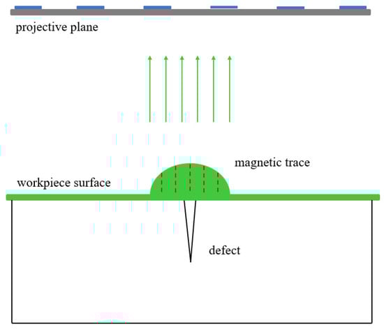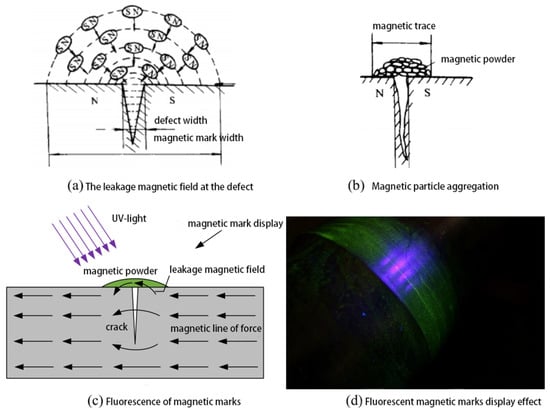 Magnetic particle testing is a method for detecting defects by identifying the accumulation of magnetic particles forming magnetic traces at defect locations [12]. The principle is illustrated in Figure 3: after magnetization, a magnetic field is generated inside the ferromagnetic material of the workpiece. When defects are present on or near the surface of the workpiece, the discontinuity of material at the defect causes a local change in magnetic permeability, resulting in a distortion of the magnetic field and the leakage of magnetic flux from the workpiece surface, forming a leakage magnetic field. Under the influence of the leakage magnetic field, magnetic particles are attracted and gather at the defect location, forming magnetic traces associated with the defect’s leakage magnetic field. These traces can highlight defects that are not easily visible, and by observing and analyzing the geometric shape of the magnetic traces, workers can identify surface defects on the workpiece. Fluorescent magnetic powder, containing fluorescent dyes, emits yellow-green fluorescence in the 510–550 mm wavelength range when exposed to ultraviolet light. This creates a high-contrast fluorescence against the workpiece’s surface color, making the magnetic traces easier to observe. Especially when using fluorescent magnetic powder in a darkroom, the fluorescence of the magnetic traces exhibits extremely high contrast with the workpiece surface, significantly enhancing the sensitivity and inspection speed of magnetic particle testing.